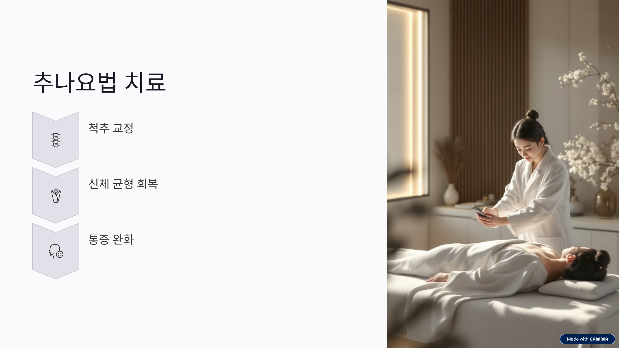 - 관절과 척추의 정렬 개선: 사고 충격으로 미세하게 틀어진 척추 관절을 재정렬하여 신경 압박을 줄이고 통증을 완화합니다.
