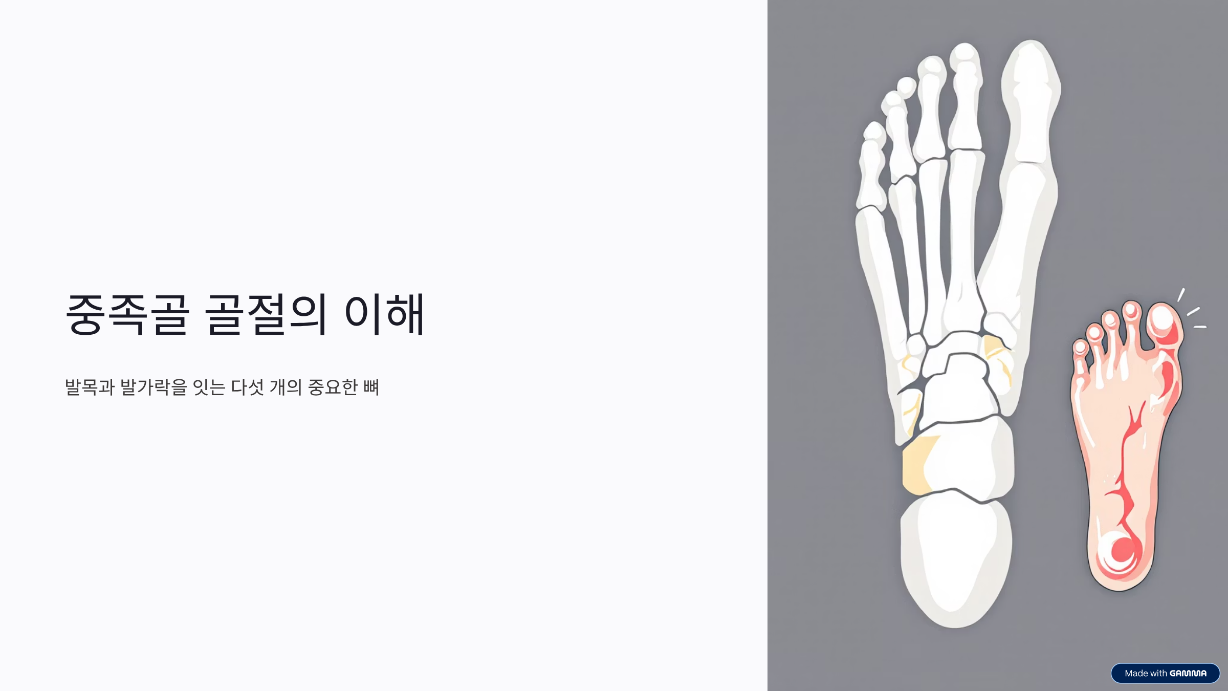 우리 몸의 발은 서고, 걷고, 뛰는 모든 활동의 시작점이자 끝점입니다. 이 중요한 발을 지탱하고 움직이게 하는 핵심적인 뼈가 바로 발등뼈라고 불리는 **중족골**입니다. 중족골은 발목과 발가락을 연결하는 5개의 긴 뼈로 이루어져 있으며, 마치 아치형 교량처럼 우리 몸의 체중을 효과적으로 분산시키고, 외부에서 가해지는 충격을 흡수하는 중요한 역할을 수행합니다. 그러나 이러한 기능적 중요성 때문에 중족골은 외부 충격에 매우 취약한 부위이기도 합니다. 과격한 스포츠 활동을 하는 운동선수들은 물론, 일상생활에서 무거운 물건을 발등에 떨어뜨리거나, 계단을 헛디뎌 발을 삐끗하는 것만으로도 쉽게 골절이 발생할 수 있습니다. 중족골 골절이 흔한 이유가 바로 여기에 있습니다. 예상치 못한 순간에 찾아오는 강한 충격이 우리 몸의 가장 민감한 부위 중 하나인 발등에 집중될 때 발생하는 것이죠.