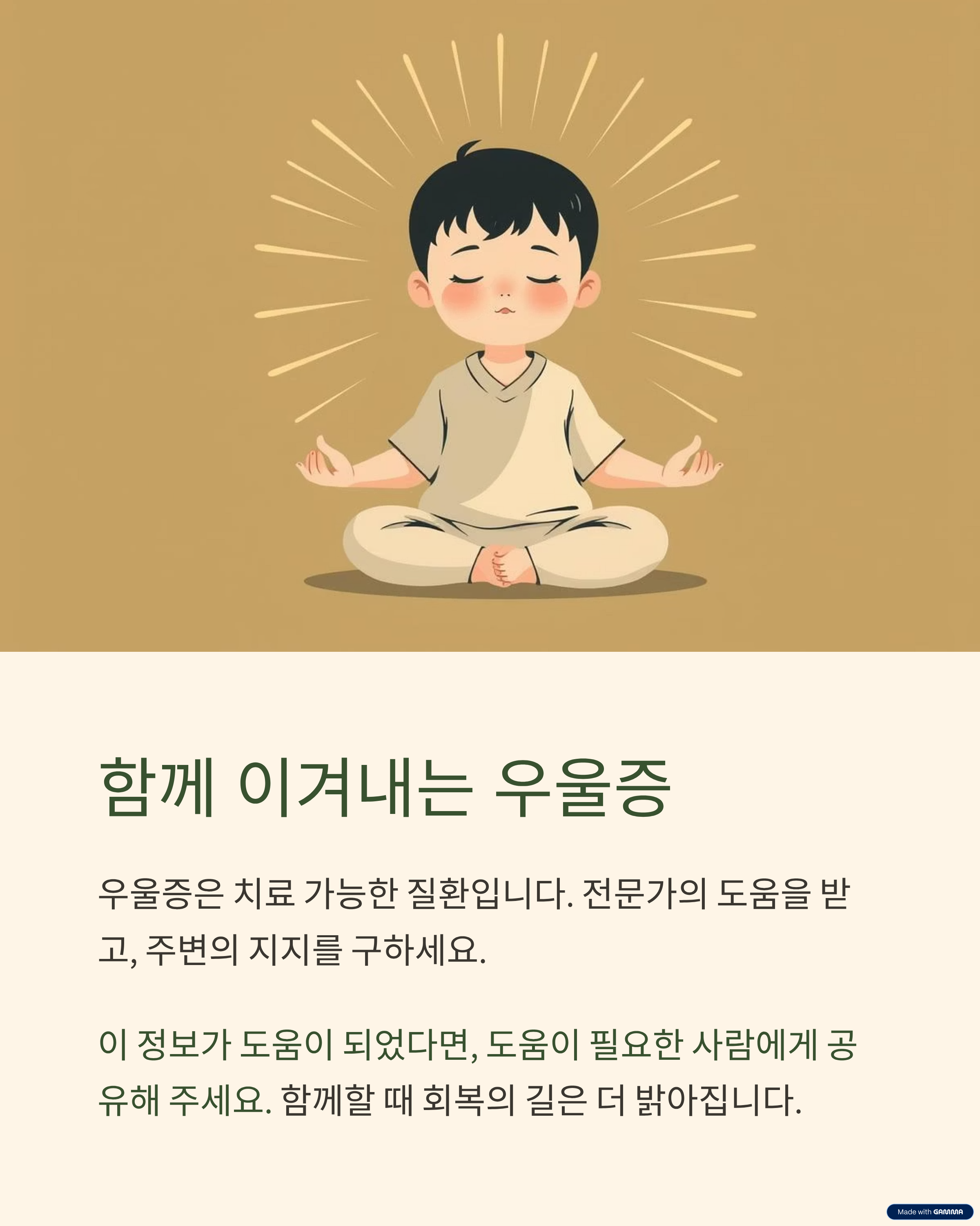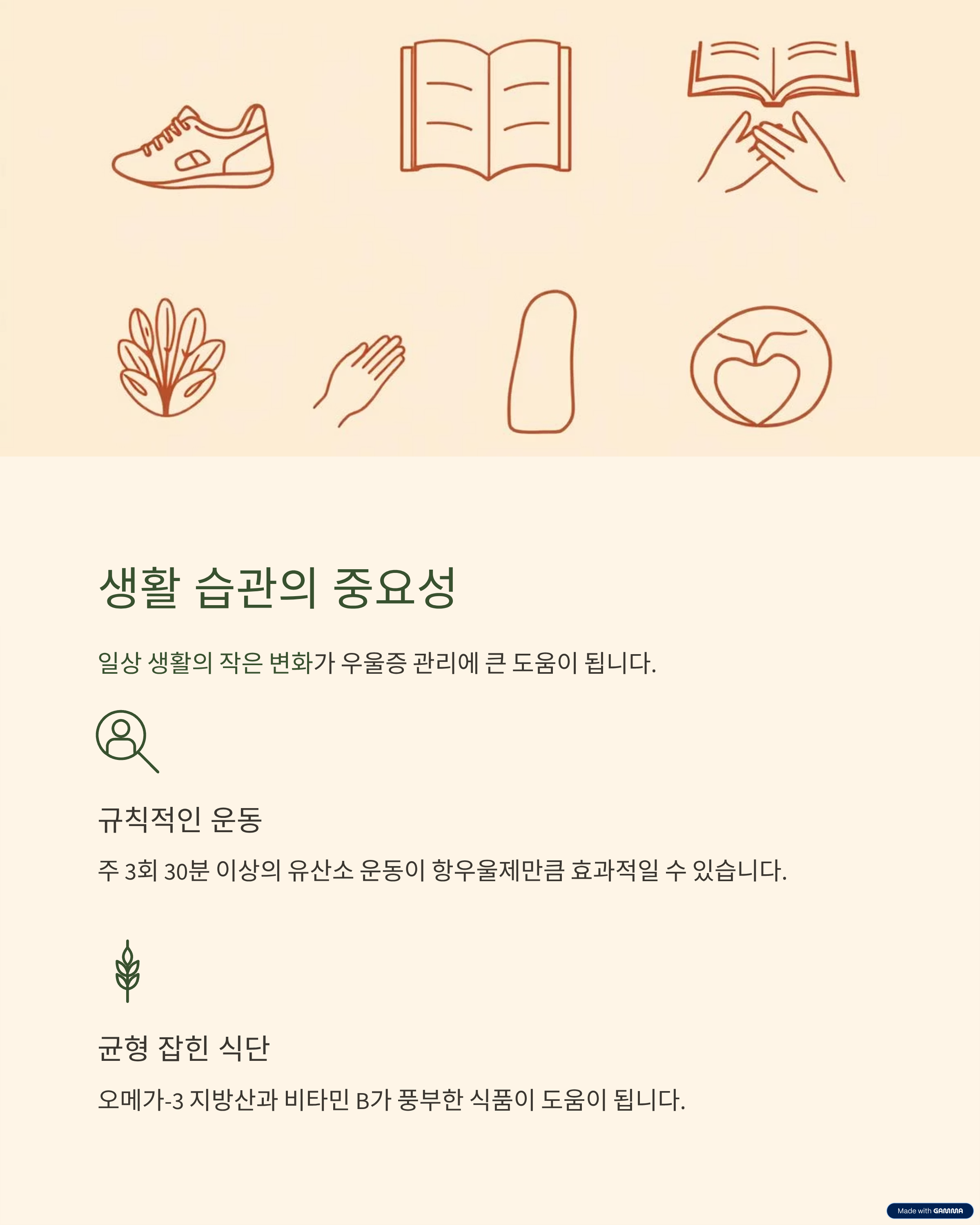 치료와 더불어 일상적인 생활 습관의 변화도 회복에 큰 힘이 된다. 첫째, **규칙적인 수면과 식사**는 뇌 기능의 안정에 필수적이다. 둘째, **꾸준한 운동**은 뇌의 신경생성 및 신경전달물질 분비를 촉진하여 항우울제와 유사한 효과를 낸다. 셋째, 알코올이나 니코틴은 일시적인 기분 개선처럼 느껴질 수 있으나, 장기적으로는 증상을 악화시키므로 피해야 한다. 마지막으로, 친구나 가족과의 **사회적 연결**을 유지하는 것은 강력한 정서적 지지 자원이 된다.