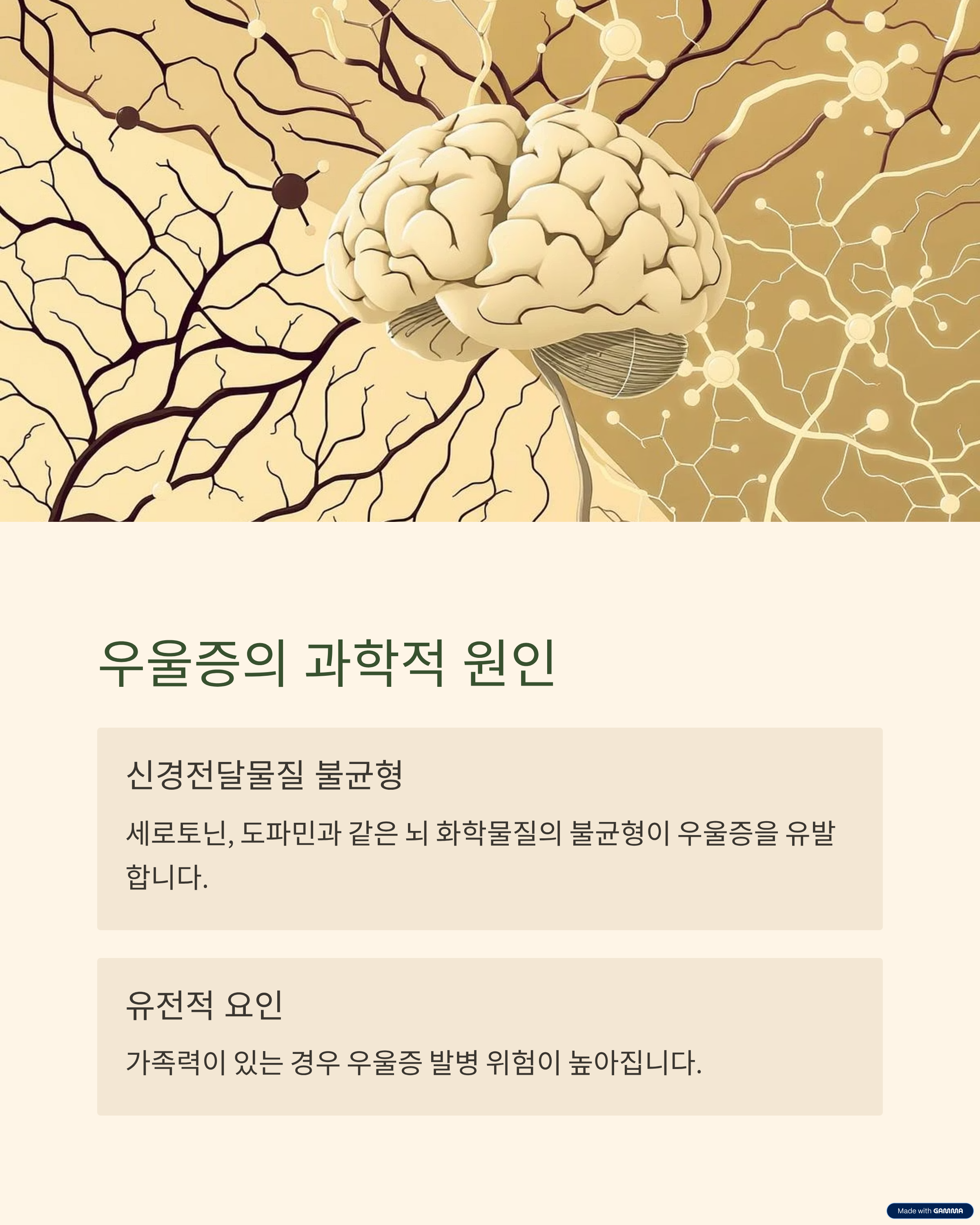 우울증은 단일 원인으로 발생하지 않는 복합적인 질환이다. **세로토닌, 노르에피네프린, 도파민**과 같은 뇌의 신경전달물질 시스템의 불균형이 주요 원인으로 꼽힌다. 이 물질들은 우리의 기분, 수면, 식욕 등을 조절하는 중요한 역할을 한다. 이 외에도 유전적 소인, 만성 질환, 호르몬 변화(특히 출산 후), 계절적 변화, 그리고 반복되는 스트레스나 상실 경험 같은 환경적 요인이 복합적으로 작용하여 발병에 영향을 미친다.