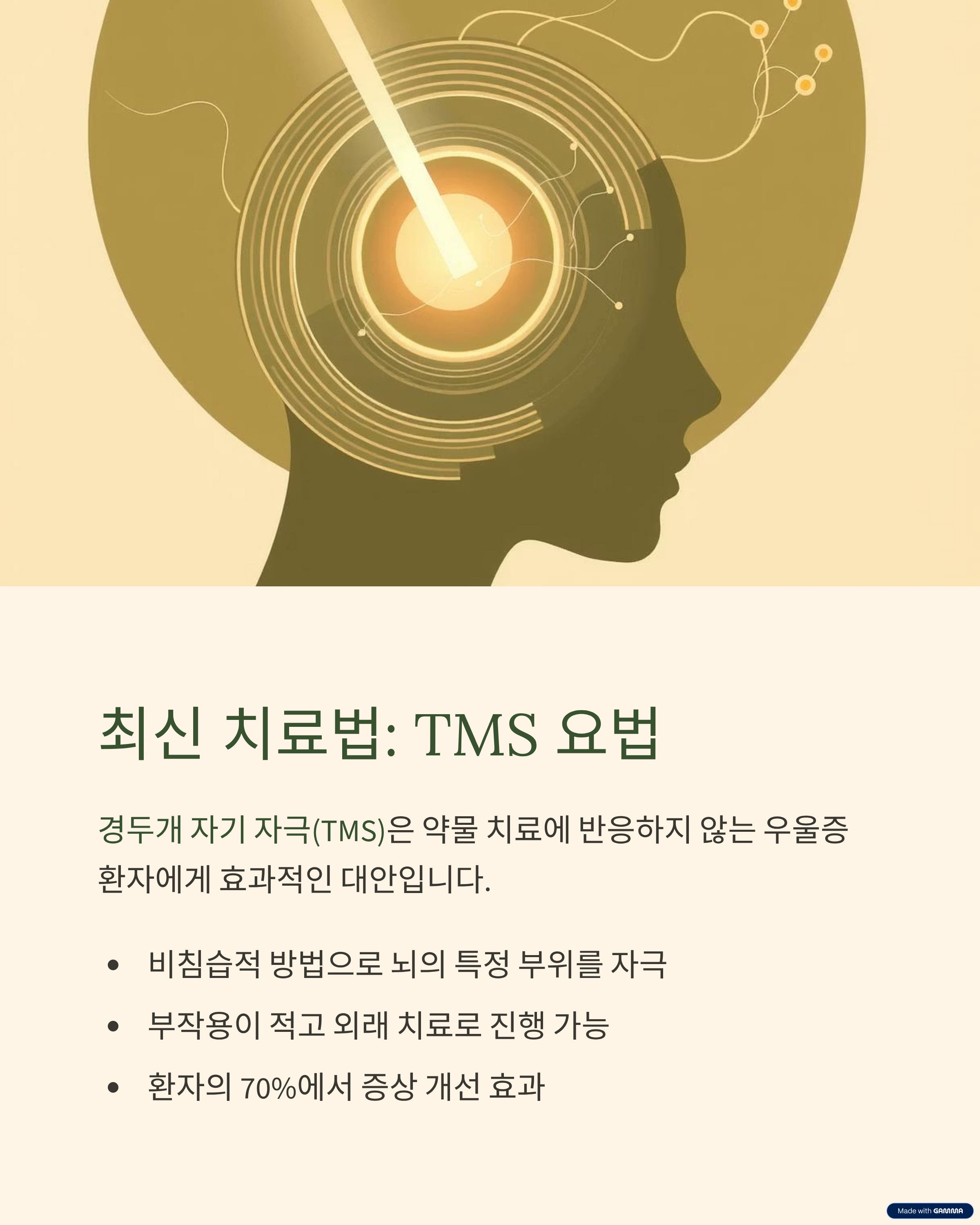 일부 환자들은 기존의 약물이나 심리치료에 반응하지 않는 '치료 저항성 우울증'을 겪기도 한다. 이 경우, 최근에는 새로운 치료법들이 등장하고 있다. 뇌의 특정 부위를 직접 자극하는 **경두개자기자극술(TMS)** 같은 뇌 자극 요법이 대표적이다. 또한, 마취제로 알려진 **케타민**이 소량 투여 시 빠르게 항우울 효과를 나타낸다는 연구 결과가 주목받고 있다. 하지만 이 치료법들은 아직 초기 단계이며, 해리나 어지러움 같은 부작용이 동반될 수 있어 전문가의 신중한 판단이 필요하다.