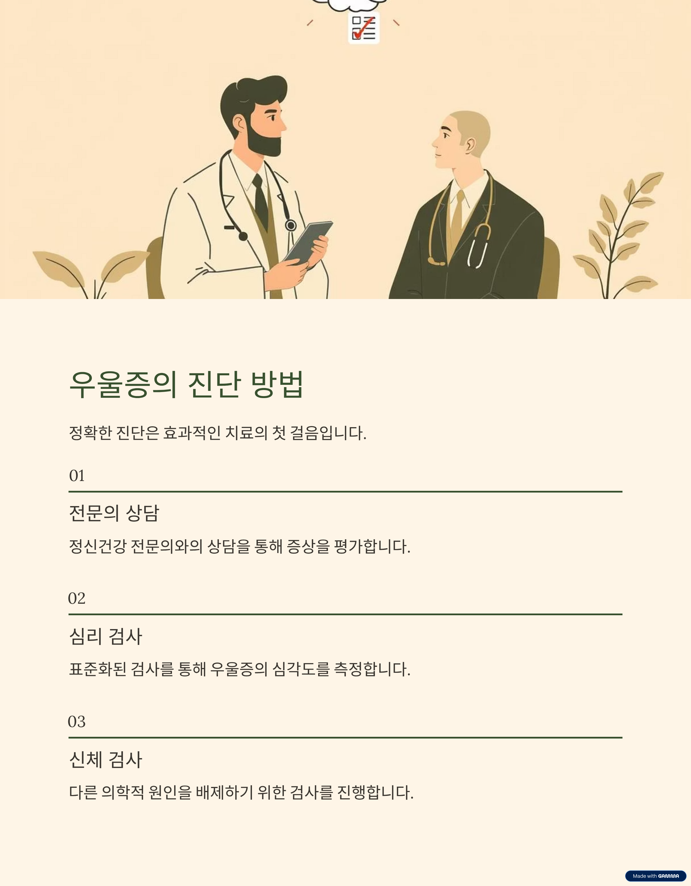 우울증 진단은 '마음이 아프면 정신과에 간다'는 사회적 낙인 때문에 미루는 경우가 많다. 하지만 우울증은 엄연한 질병이며, 조기 진단이 무엇보다 중요하다. 정신건강의학과 전문의는 환자의 우울감, 수면 패턴, 피로도, 집중력, 무기력감, 자책감 등 다양한 증상을 종합적으로 평가한다. 또한 혈액검사나 신체검사를 통해 갑상선 질환 등 우울증과 유사한 증상을 유발하는 다른 신체 질환의 가능성을 배제하는 과정도 거친다.
