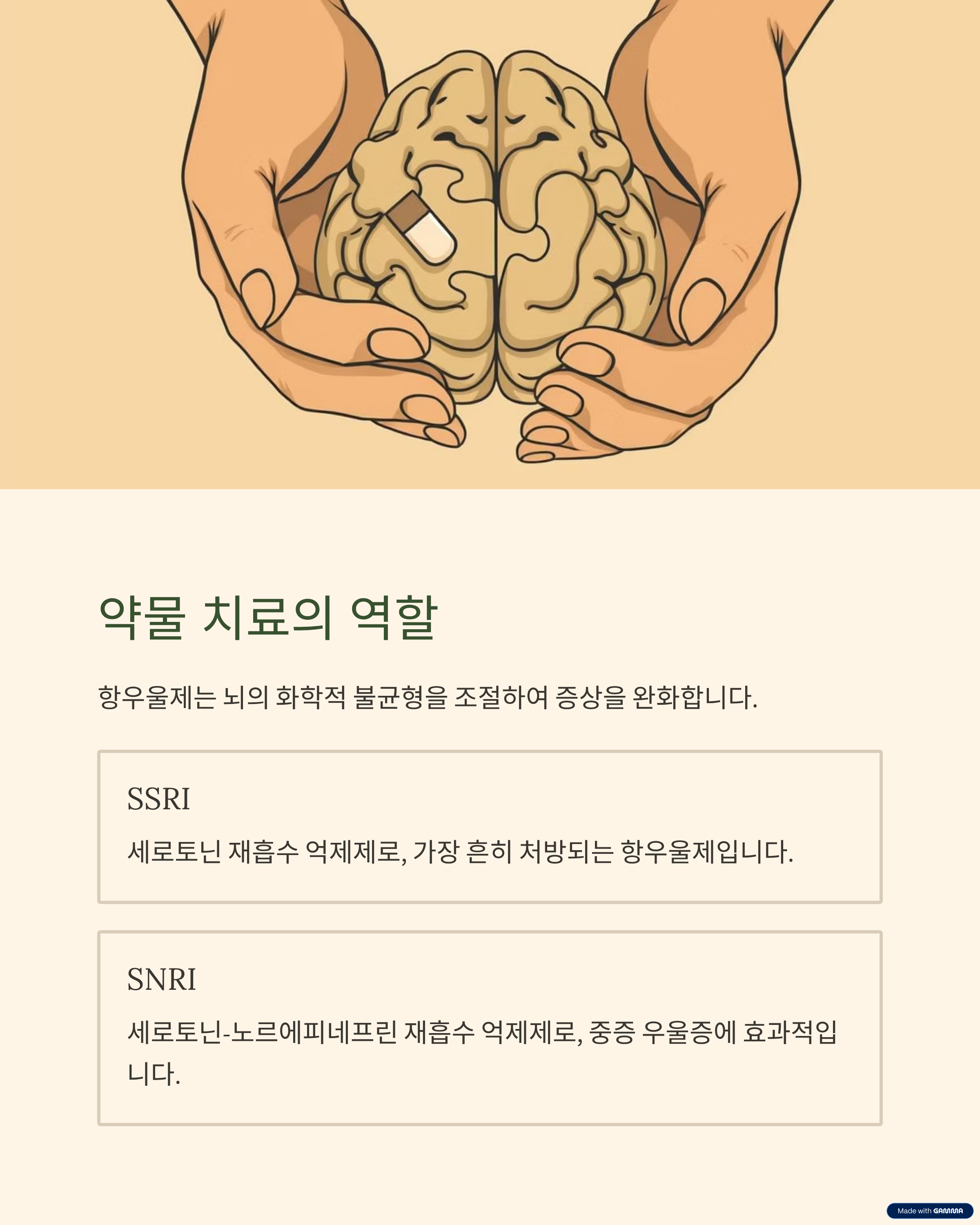 우울증 치료에는 상담이나 심리치료가 기본적으로 권장되며, 증상이 심할 경우 **항우울제**가 병행된다. 많은 사람이 항우울제에 대해 막연한 거부감을 갖지만, 항우울제는 마약이나 수면제와는 달리 의존성이 생기지 않는다. 이 약물들은 뇌의 신경전달물질 농도를 조절하여 뇌 기능을 정상화하는 역할을 한다. 다만, 약효가 나타나기까지 보통 2~4주가 걸리며, 개인마다 반응이나 부작용이 다를 수 있어 반드시 전문의의 면밀한 관찰하에 복용해야 한다.