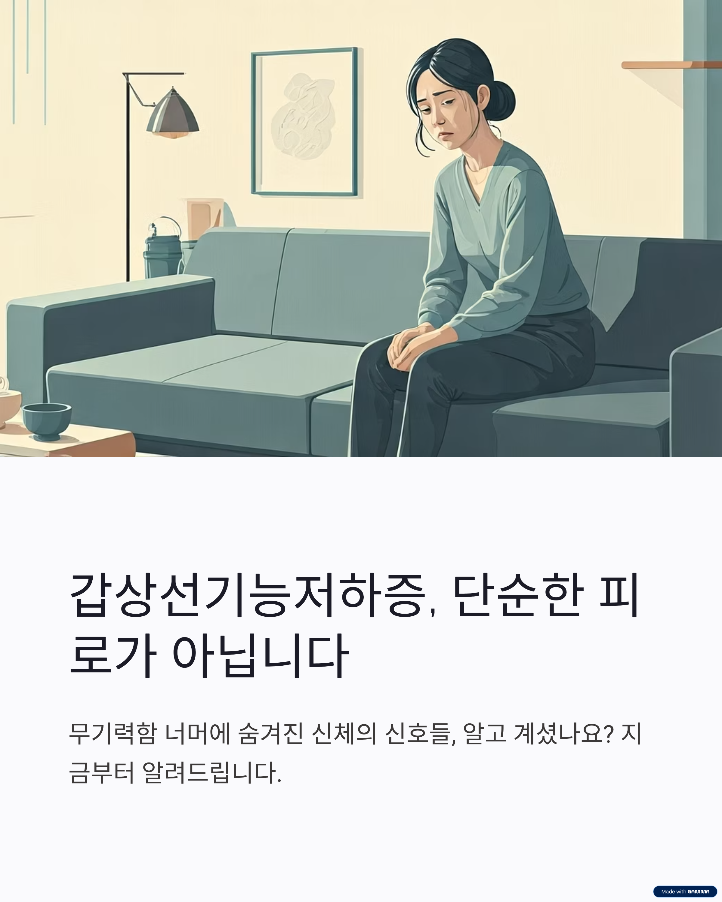 피곤하다고 해서 모두 갑상선 문제는 아닙니다. 전문가에 따르면 피로의 대부분은 정신적 요인(스트레스, 우울증 등) 때문이며, 내분비 질환이 원인인 경우는 20%도 되지 않습니다. 따라서 추위 민감, 체중 증가, 변비 같은 증상이 함께 있을 때 갑상선저하증을 의심해야 합니다.