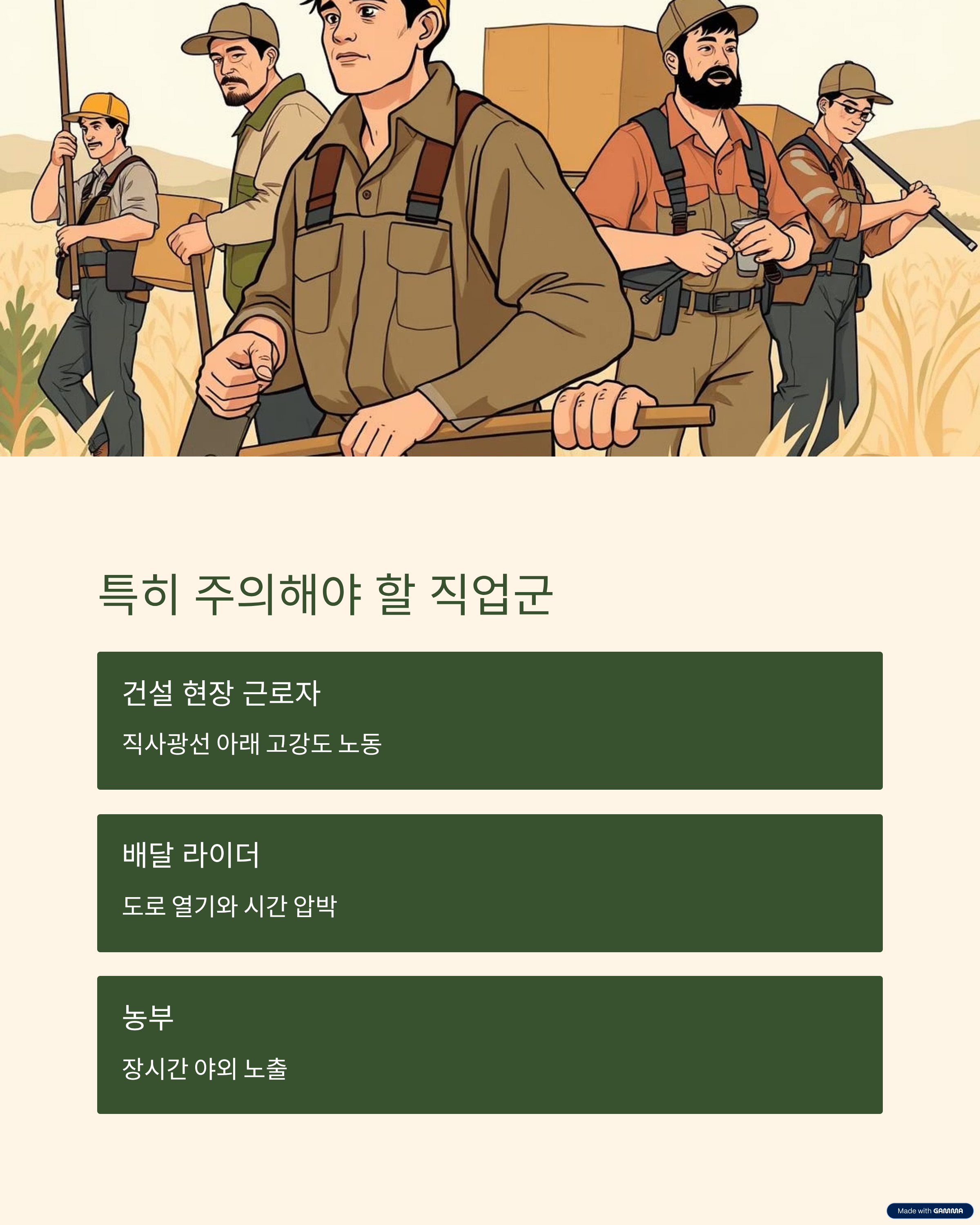 - 외출은 짧게, 복장은 밝게: 햇볕이 가장 뜨거운 정오부터 오후 5시 사이에는 야외 활동을 피하세요. 외출 시에는 모자, 양산, 밝은색 옷을 착용해 열 흡수를 최소화하는 것이 좋습니다.