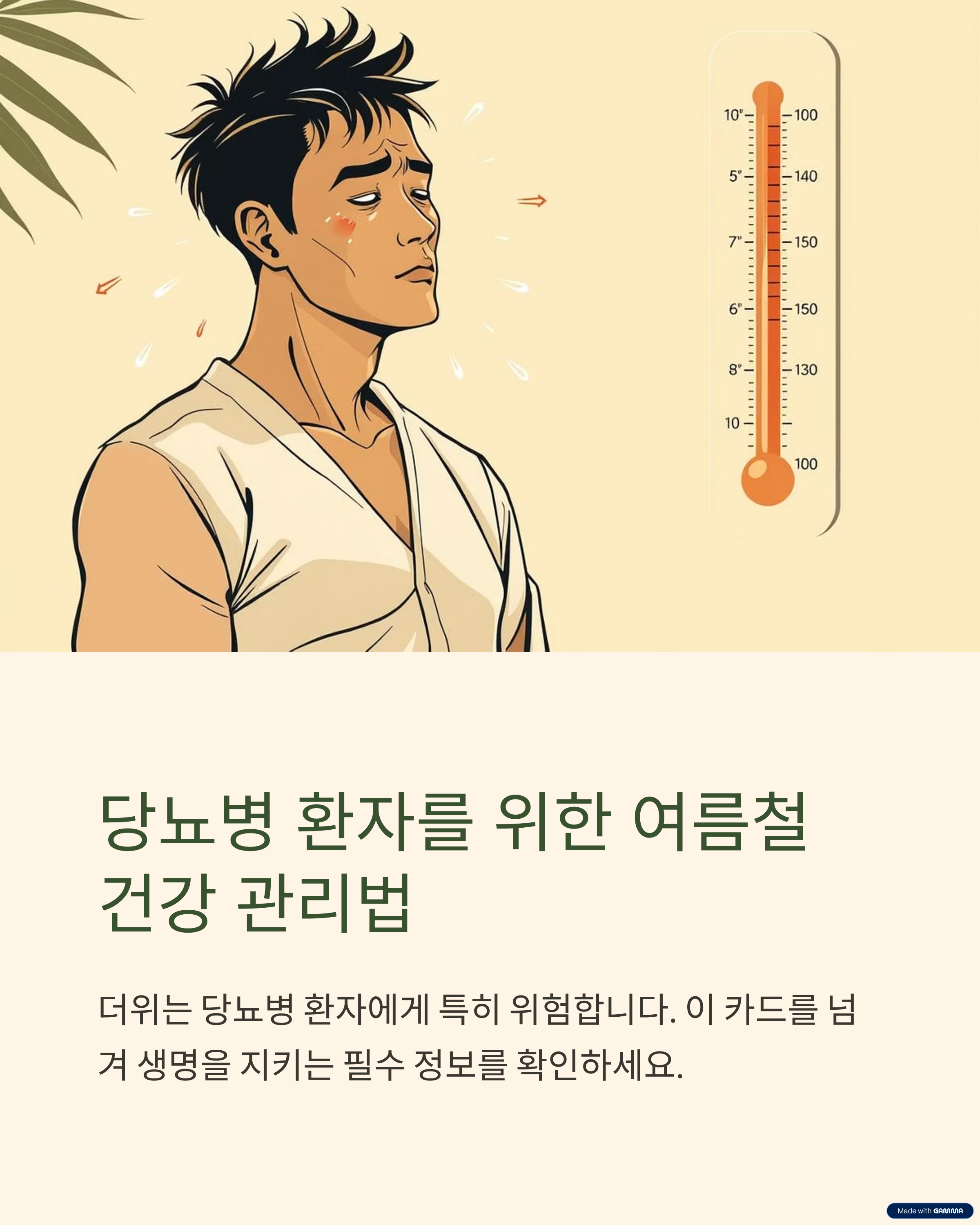 게다가 고온에 장시간 노출되면 몸은 땀을 많이 흘려 탈수 상태가 되기 쉽습니다. 이로 인해 혈액의 농도가 짙어지면서 일시적으로 혈당 수치가 상승하고, 기존의 합병증이 악화될 수 있습니다. 심지어 식욕 저하로 끼니를 거르게 되면 저혈당 쇼크의 위험까지 커지므로, 단순한 더위가 아닌 복합적인 건강 위험에 노출되는 것입니다.
