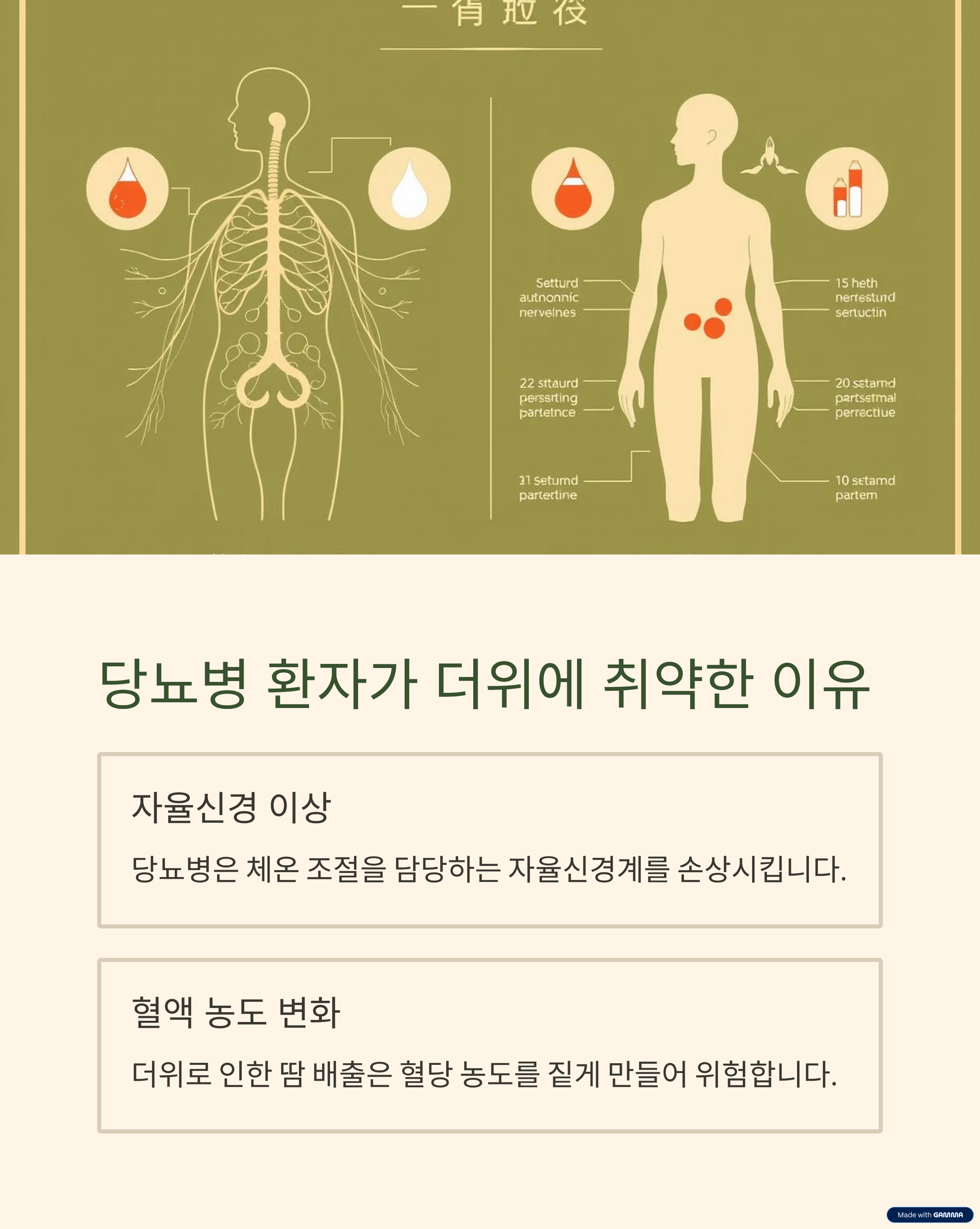 왜 당뇨병 환자는 더위에 더 취약할까요? 핵심은 바로 자율신경 기능 저하에 있습니다. 우리 몸의 자율신경계는 체온을 일정하게 유지하기 위해 땀 분비나 혈관 확장 등을 조절하는 중요한 역할을 합니다. 하지만 당뇨병이 진행되면서 이 자율신경 기능이 떨어지면, 몸이 더위에 효율적으로 적응하지 못하게 됩니다.