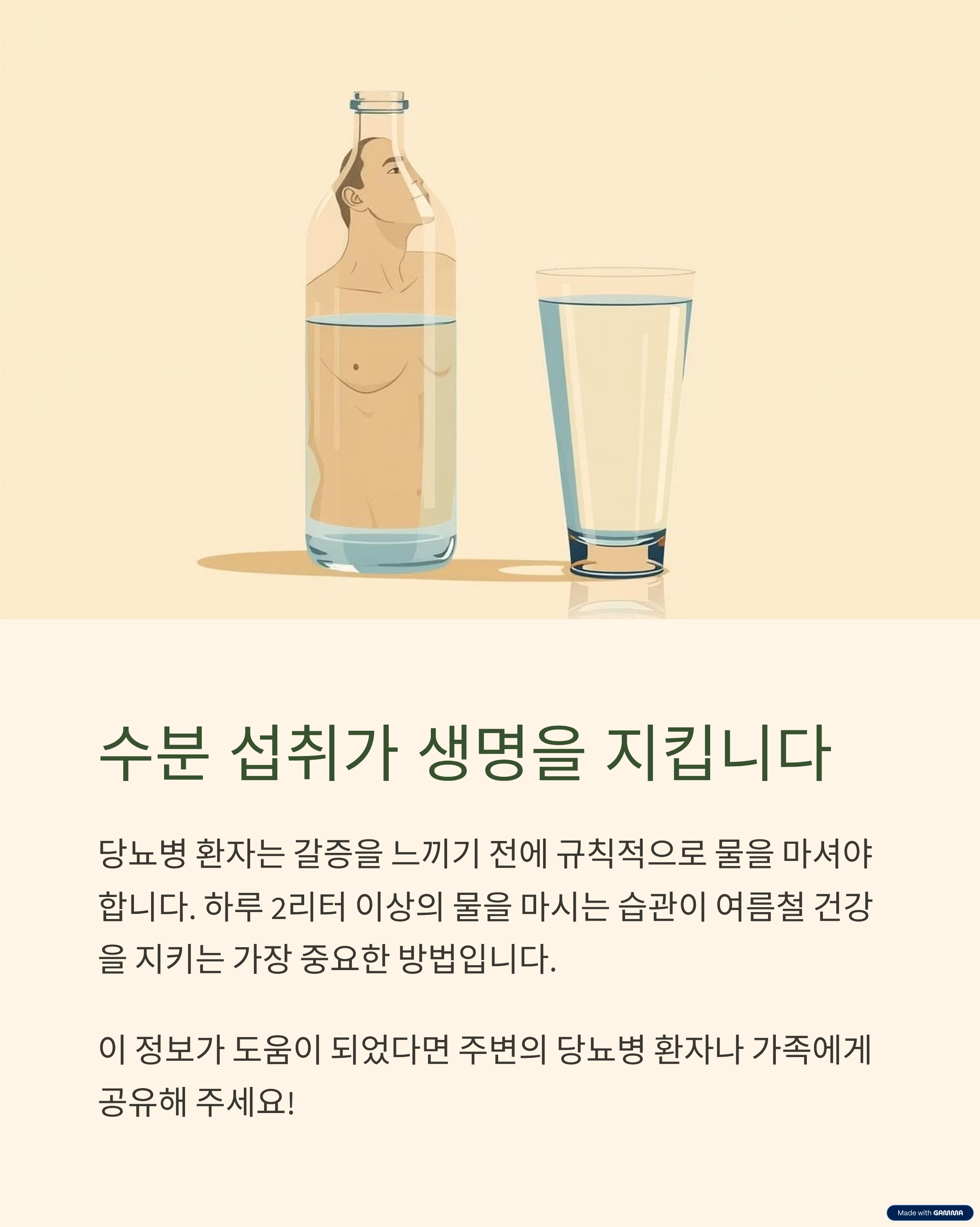 폭염과 열대야는 식욕과 수면을 방해하여 생활 리듬을 깨뜨리기 쉽습니다. 하지만 당뇨병 환자에게 있어 규칙적인 생활은 혈당 관리에 있어 핵심적인 요소입니다. 식사를 거르지 않고, 정해진 시간에 운동하며, 충분한 수면을 취하는 규칙적인 습관이야말로 여름철 건강을 지키는 가장 기본적인 방패입니다. 무더운 날씨에 몸이 피곤하다고 해서 이러한 규칙을 소홀히 한다면, 혈당 수치가 불안정해지면서 다양한 합병증의 위험에 노출될 수 있습니다.