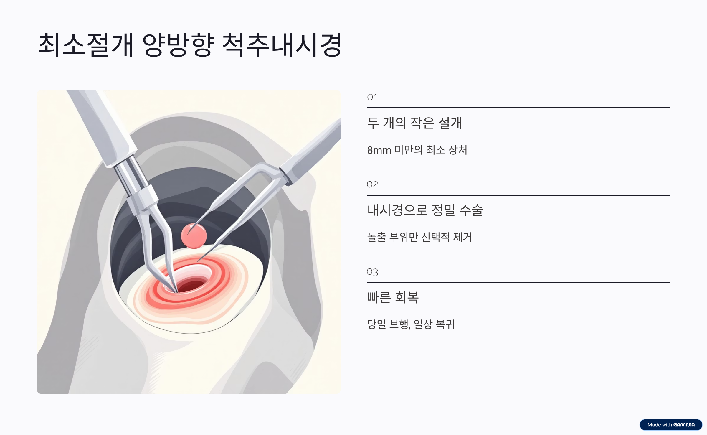 이 수술의 가장 큰 장점은 최소 절개로 인해 신경 손상의 위험이 낮고, 수술 후 통증과 흉터가 적어 회복이 빠르다는 점입니다. 입원 기간이 짧아 바쁜 직장인이나 활동량이 많은 환자에게 특히 효과적인 대안이 될 수 있습니다.