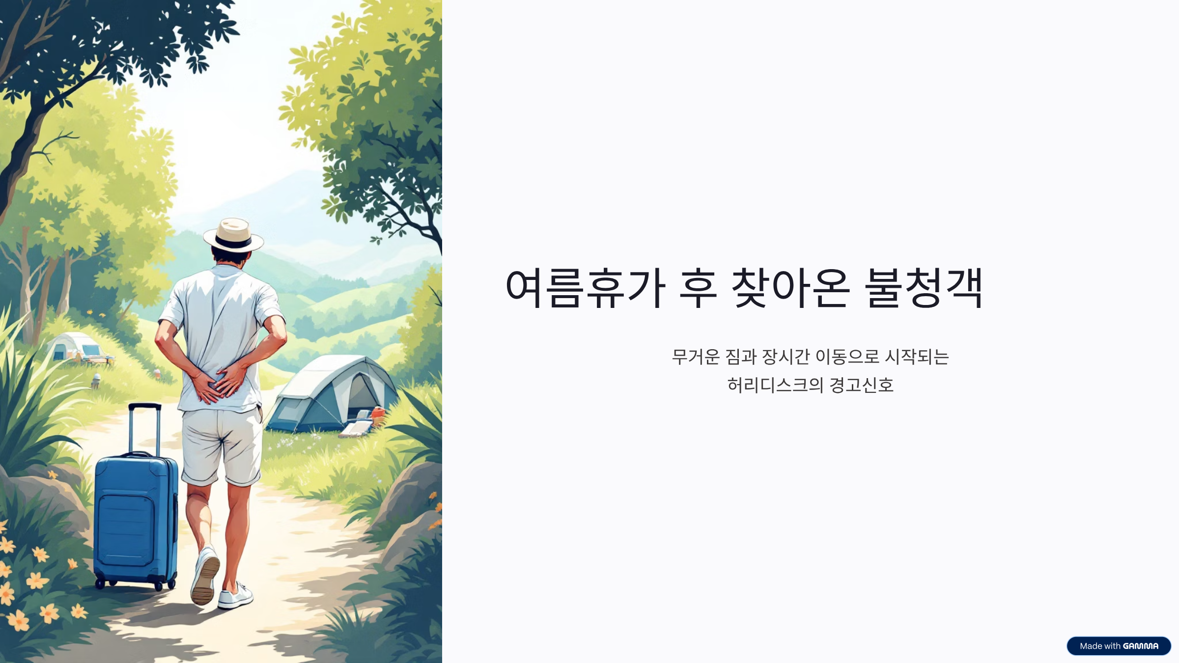 본격적인 여름 휴가철, 들뜬 마음으로 떠난 여행길이 허리 통증으로 얼룩지는 경우가 많습니다. 장거리 운전, 장시간 비행, 그리고 물놀이, 등산, 캠핑 등 평소보다 활동량이 급격히 늘어나면서 허리에 과도한 부담이 가해지기 때문입니다. 특히 무거운 짐을 옮기거나 허리를 갑자기 삐끗하는 동작은 척추에 큰 충격을 줄 수 있습니다. 많은 사람이 이를 단순한 근육통으로 치부하고 방치하지만, 반복되는 허리 통증은 허리디스크(추간판탈출증)의 초기 신호일 수 있습니다. 자칫 방치하면 만성 질환으로 악화되어 삶의 질을 크게 떨어뜨릴 수 있어 주의가 필요합니다.
