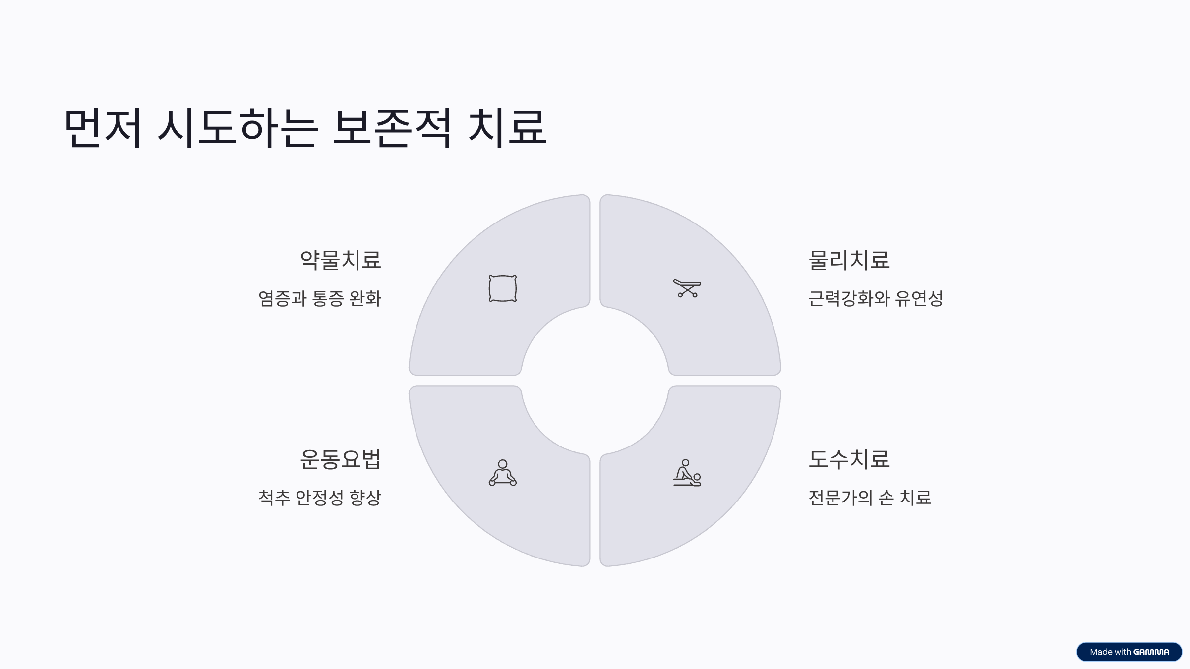 - 약물치료: 소염진통제나 근육이완제를 복용하여 염증과 통증을 완화합니다.