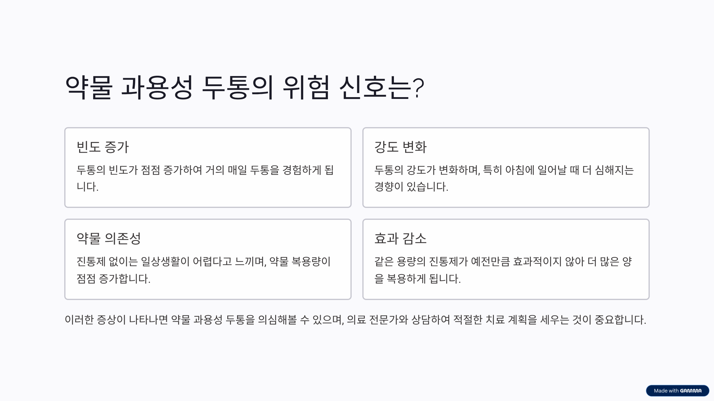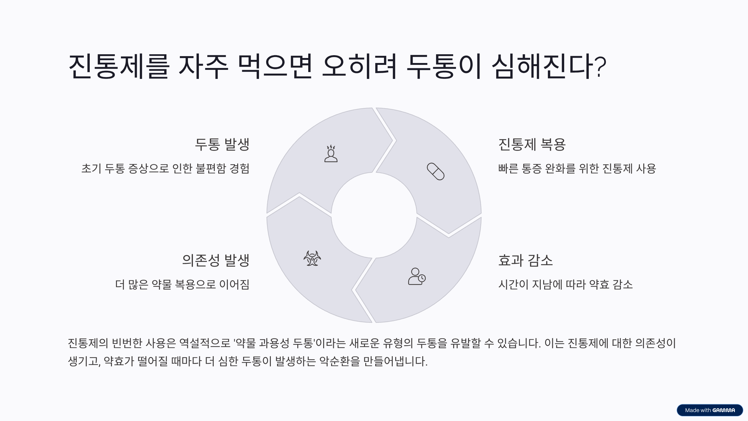 올바른 정보 및 실천 방안 (Solution): 진통제 복용량은 의사나 약사의 지시를 정확히 따르고, 자의적으로 늘리지 않아야 합니다. 한 달에 10일 이상 진통제를 복용하는 습관이 있다면, 즉시 전문가의 도움을 받아야 합니다.