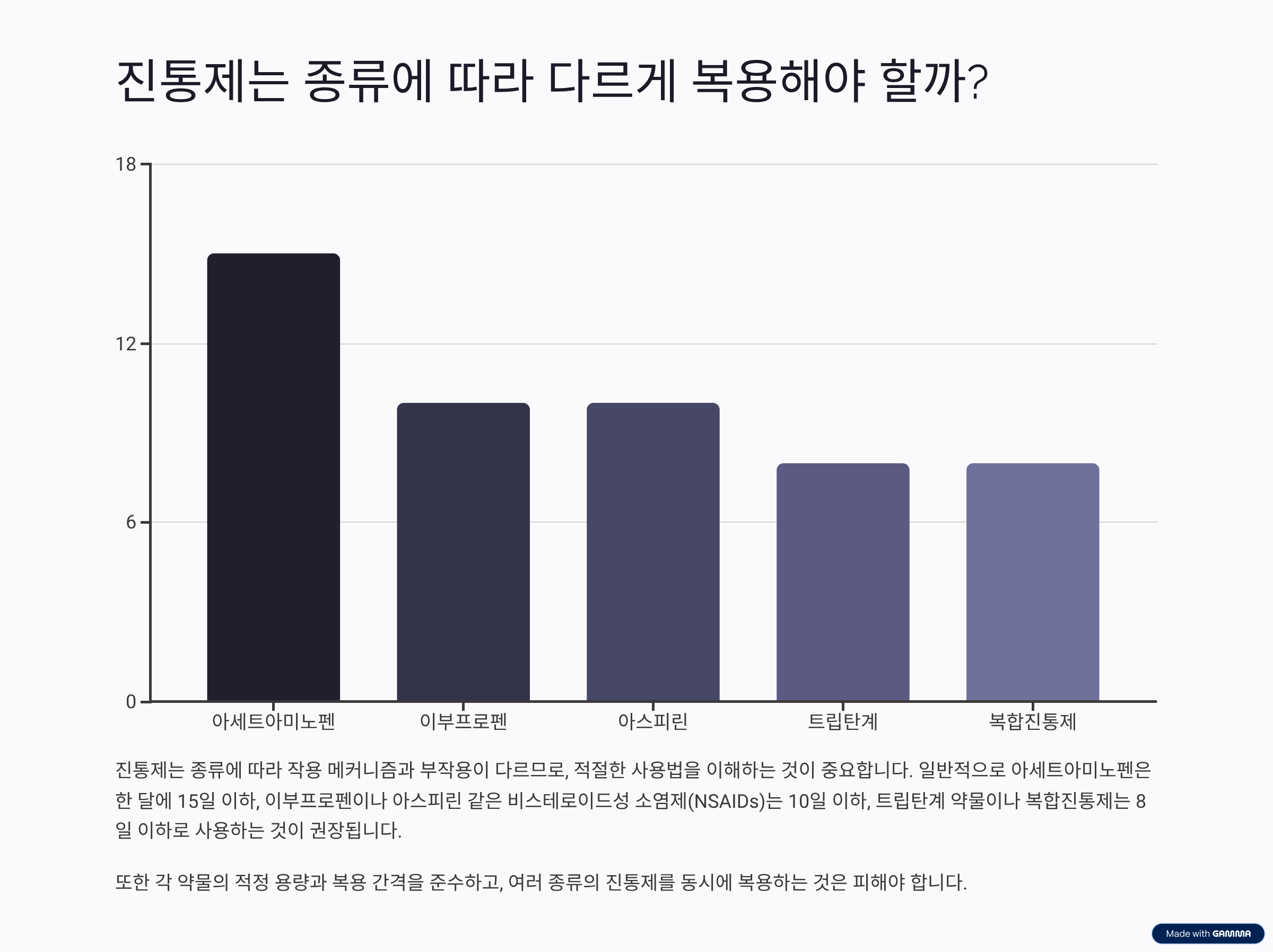 팩트 체크 (Fact Check): 진통제는 성분에 따라 작용 기전과 부작용이 다릅니다. 아세트아미노펜 계열은 간 독성이, 이부프로펜 등 비스테로이드성 소염진통제(NSAIDs)는 위장 장애나 신장 기능 저하의 위험이 있습니다. 대한두통학회는 개인의 건강 상태와 두통 유형에 맞는 진통제를 선택하고, 복합 진통제는 여러 성분이 포함되어 있으므로 약물 과용성 두통의 위험이 더 높다고 경고합니다.