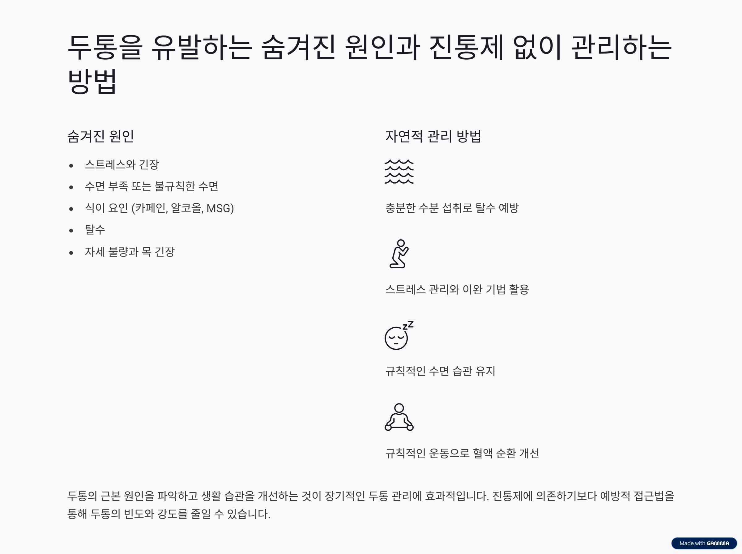 오해의 원인 분석 (Why the Misunderstanding): 두통이 발생했을 때 그 원인을 외부 환경이나 특정 질병에서만 찾으려 하고, 자신의 생활 습관을 되돌아보지 않는 경우가 많습니다.