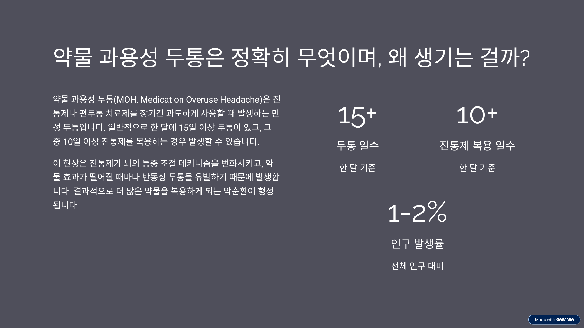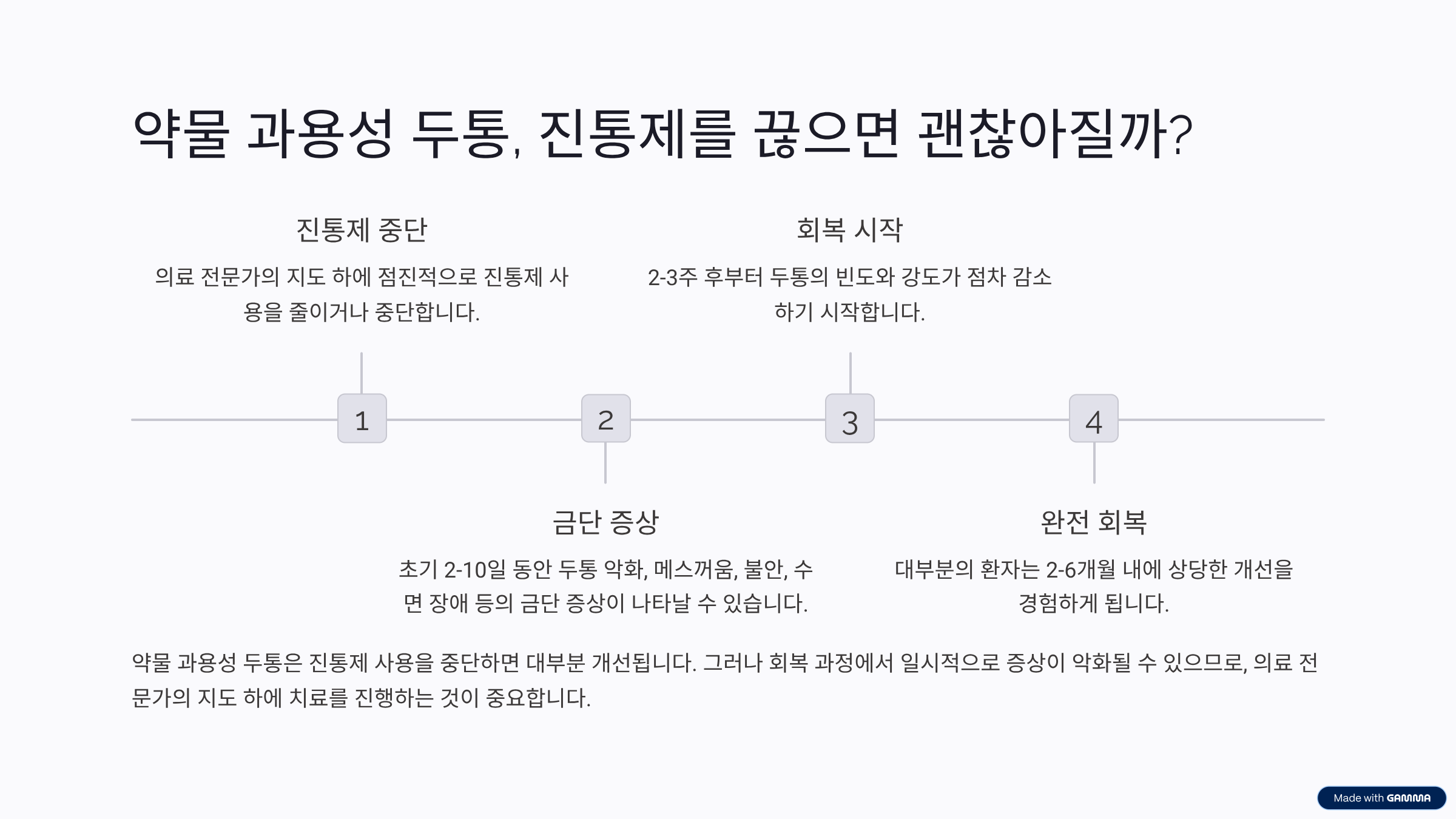 잘못된 상식 (Challenge): 진통제를 끊으면 두통이 더 심해질 테니 절대 끊을 수 없다.