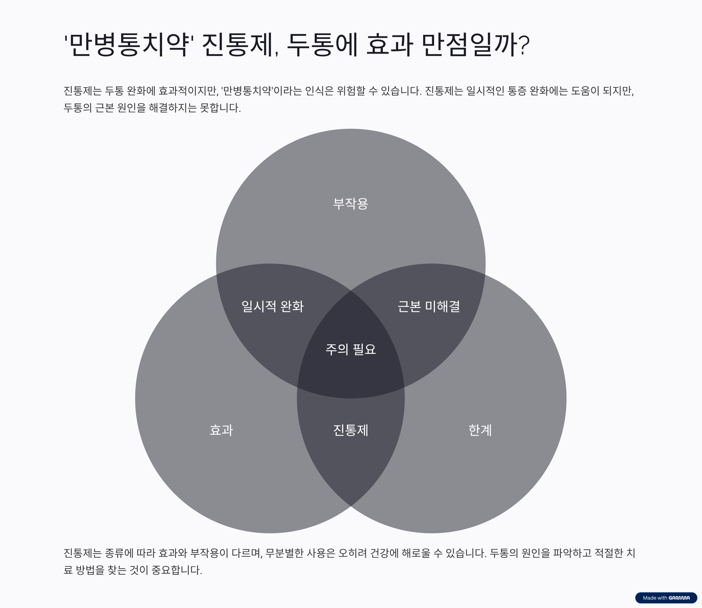 오해의 원인 분석 (Why the Misunderstanding): 진통제가 약국에서 쉽게 구할 수 있는 '일반의약품'이다 보니, 그 위험성을 간과하기 쉽습니다. 또한, 즉각적인 통증 완화 효과 때문에 의존성이 생겨 습관적으로 복용하게 됩니다.
