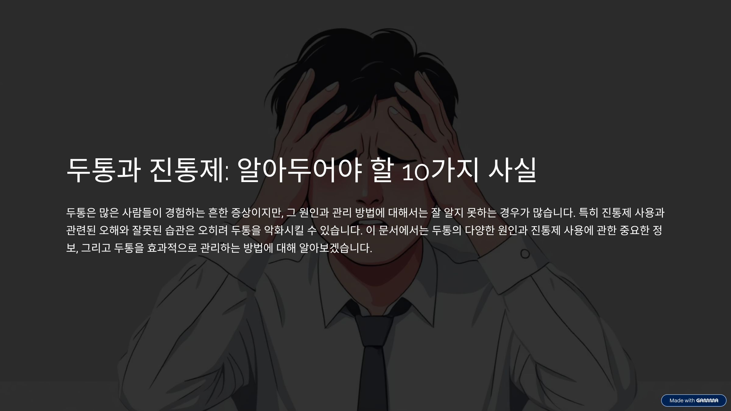 오해의 원인 분석 (Why the Misunderstanding): 두통이 워낙 흔한 증상이다 보니, 많은 사람이 그 심각성을 간과하는 경향이 있습니다. 특히 일시적인 통증 완화를 목적으로 하는 진통제 광고나 주변 사람들의 경험담이 '두통 = 진통제'라는 공식을 굳히게 만들었습니다.
